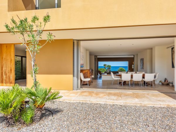 Fließende Übergänge von dem Wohn-Speise und Küchenbereich sowie von den Schlafbereichen auf die Terrassen zum Meer und von den Blick geschützten Innenhöfen auf die Bergkulisse.