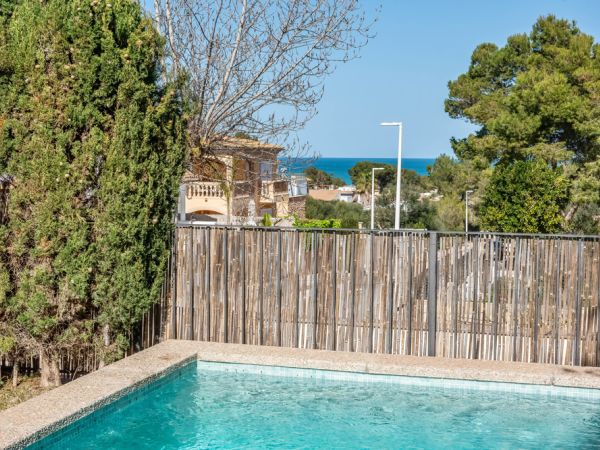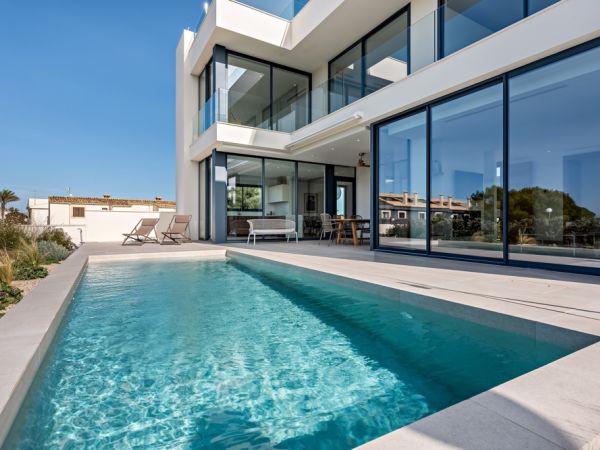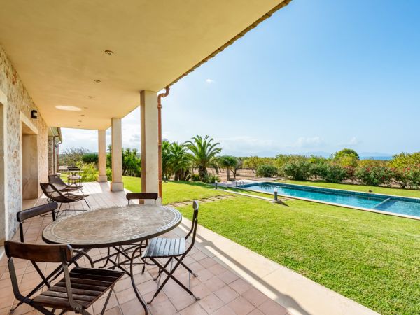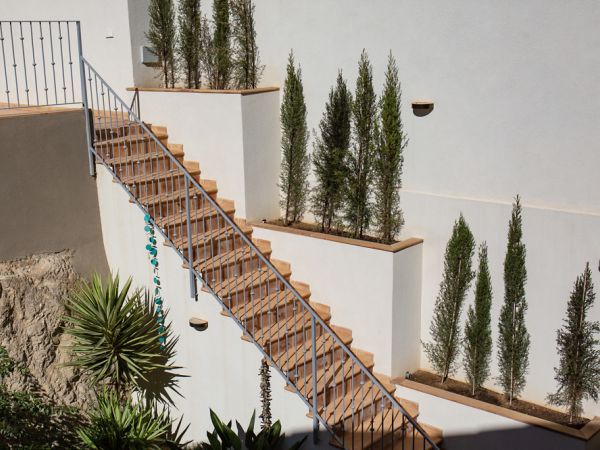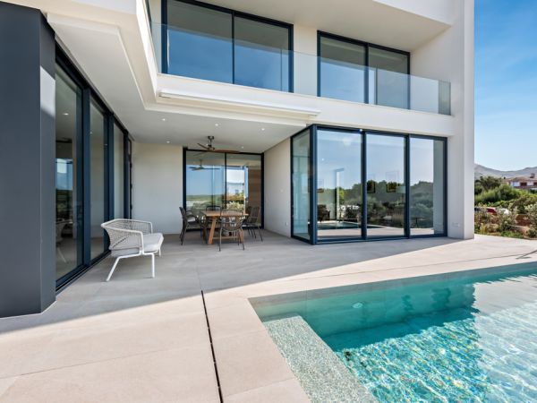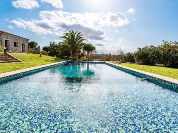 Der Außenbereich wurde auf mehreren Ebenen gestaltet. Der Patio besticht durch sein mallorquinisches Flair und wurde mit einem sehr aufwendigen Bodenbelag versehen. Im oberen Bereich befindet sich ein Pool, der an sonnigen Tagen für die entsprechende Abkühlung sorgt.