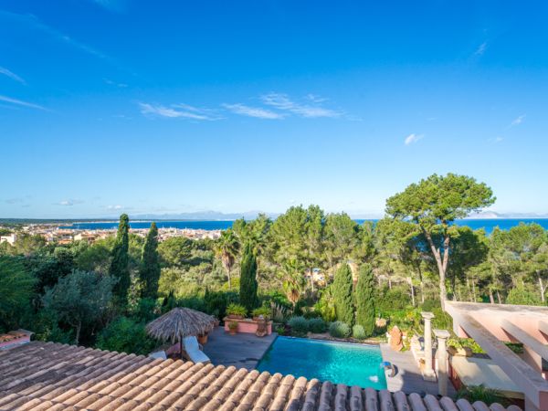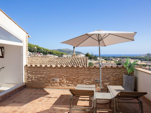 Die große Dachterrasse über die gesamte Hausfläche bietet einen 360 Grad Blick über die Bucht, die Berge der Tramuntana und der Sierra Llevante.