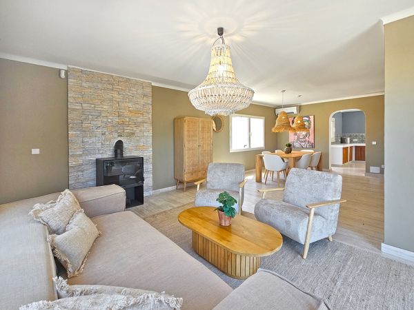 Dank Klimageräten in allen Wohnräumen genießt man auch an heißen Tagen angenehme Temperaturen. In der kühleren Jahreszeit sorgt ein Kaminofen für behagliche Wärme.