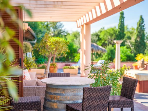 Die gepflegten Gartenbereiche rund um das Haus gehen oberhalb des Gebäudes in naturbelassene Flächen über, die bis in die Hänge der Sierra de Llevant reichen.