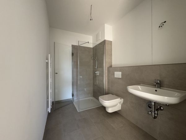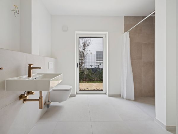 Die barrierefreie Bad mit Wanne und bodengleicher Dusche wurden mit Wandfliesen von Villeroy & Boch Crossover grau matt, 150x600 mm und Bodenfliesen ebenfalls von Villeroy & Boch Crossover grau matt, 300x600 mm ausgestattet. In den gefliesten Duschen wurden 150x150 mm Fliesen in Grau matt von Villeroy & Boch Crossover verlegt. Moderne Sanitärobjekte von Vigour und edle Armaturen von Vigour und Keuch runden die ansprechende Ausstattung im Bad ab.