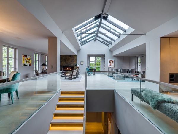 Eine elegant inszenierte Treppe mit Lederhandlauf führt in das zweite Obergeschoss. Hier erwarten Sie zwei Schlafzimmer mit Bädern en suite, ein Gäste-Duschbad sowie ein rund 40 Quadratmeter großes Büro mit integrierter Bar. Die Etage beeindruckt durch ihre Großzügigkeit, eine Deckenhöhe von 3,80 Metern und viel Tageslicht.