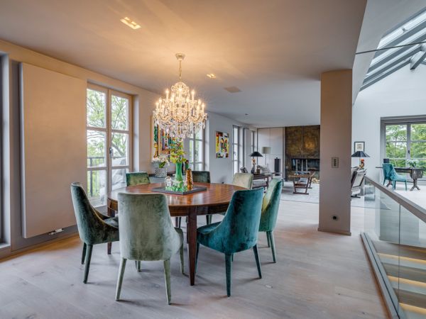 Der rund 142 Quadratmeter große Wohn- und Essbereich wird von einer Glasdachkonstruktion belichtet und öffnet sich zu allen Seiten. Bodentiefe Fenster, fließende Übergänge und ein stilvoller Kamin verleihen dem Raum eine offene und warme Ausstrahlung. Drei Dachterrassen mit Ausblick in alle Himmelsrichtungen bieten Rückzug und Ruhe inmitten der Stadt.