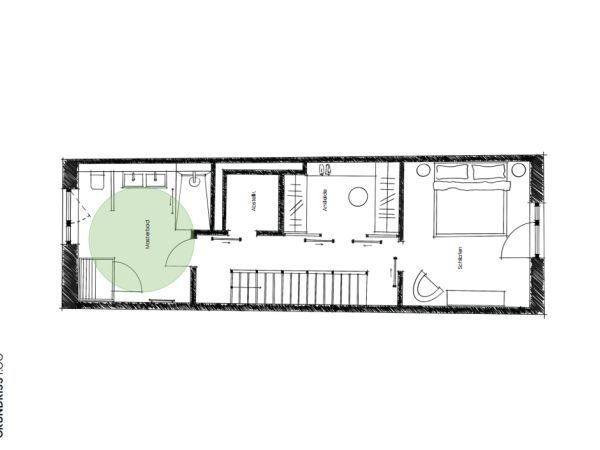 Das über 30 Quadratmeter große Hauptschlafzimmer verfügt über einen begehbaren Ankleidebereich und ein elegantes Bad mit freistehender Wanne, separater Dusche und hochwertigen Details wie Naturstein, Leder und Hornarmaturen. Bodentiefe Sprossenfenster sorgen für Ausblick ins Grüne und eine ruhige, stilvolle Wohnatmosphäre.