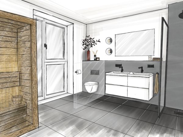 • Masterbad mit eigener Sauna, Doppelwaschtisch und Armaturen in der Black-Line
