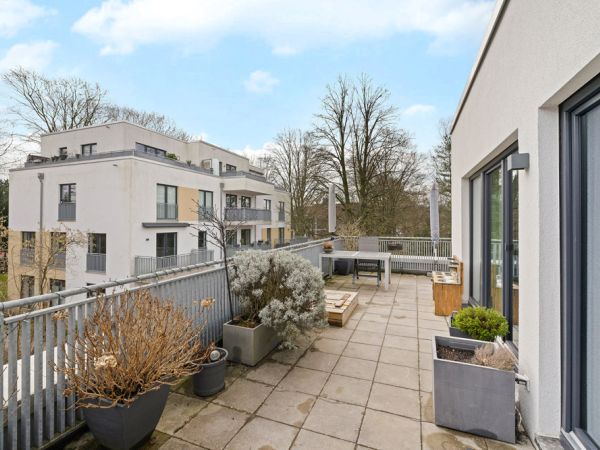 Die Dachterrasse erstreckt sich über die gesamte Wohnungsbreite und ist sowohl vom Wohnbereich als auch von den Schlafräumen zugänglich. Sie bietet vielfältige Nutzungsmöglichkeiten, von entspannten Rückzugsorten bis hin zu geselligen Abenden im Freien.