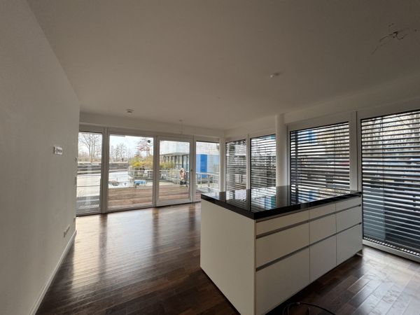 Sie betreten die Wohnung und gelangen in einen großzügigen Empfangsbereich, der den Blick unmittelbar in die Wasserlounge freigibt. Die Küche mit zentraler Insel bildet das Herz des Erdgeschosses, ein Ort für gemeinsames Kochen, Gespräche und einen großen Essbereich. Bodentiefe Fensterfronten sorgen für ein hohes Maß an Tageslicht und öffnen den Raum zur weitläufigen Südwest-Terrasse mit Wassergarten.